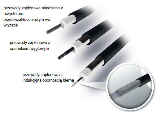 - przewody zapłonowe miedziane z rezystorem przeciwzakłóceniowym we wtyczkach
