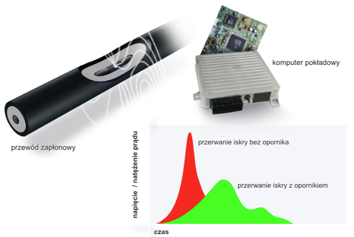 W tym celu przewody zapłonowe dysponują opornikami elektrycznymi. Ograniczają one przepięcia podczas przerwania iskry i rozładowania cewki zapłonowej. Energia z przyłożonego napięcia i prądu zostaje przekształcona w inną charakterystykę energii w funkcji czasu.