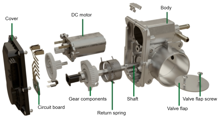 - The electronic throttle valve is controlled exclusively by a servomotor, which is activated by the engine management system via a control signal.