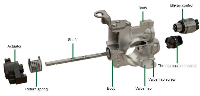 The throttle body is located in the intake tract of the combustion engine and controls the air flow that enters the engine.