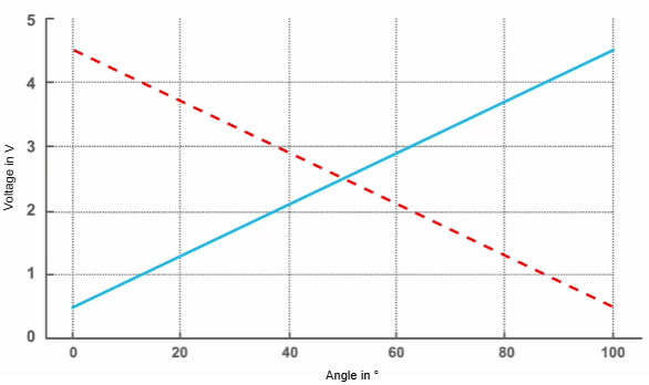 The constant sum of both signals (5 V) enables a reliable plausibility check to detect errors or deviations.