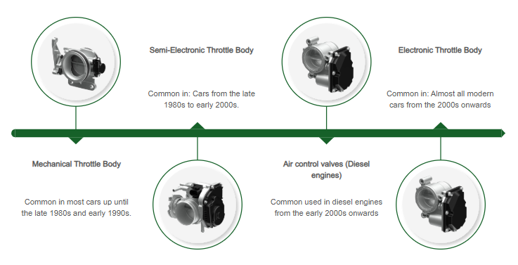 - Modern throttle bodies, particularly electronic throttle control (ETC) systems, adjust smoothly between these states based on sensor input (e.g., accelerator pedal position, engine load, and speed).