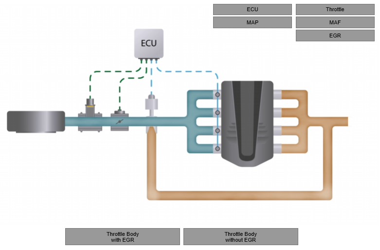 | RPM (revolutions per minute) and power output are regulated here by dosing the fresh air. | They basically do not need a throttle body. In modern compression-ignition engines, throttling the intake air volume achieves precise control of exhaust gas recirculation and prevents the engine from shaking when the engine is switched off. |