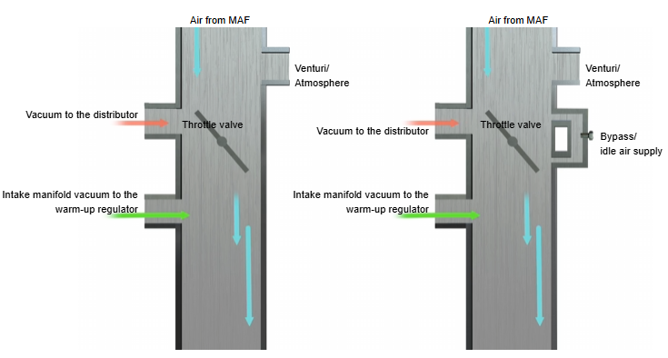 The negative pressure for the ignition timing is usually taken between the throttle valve and the engine in the intake manifold. This means that when the throttle valve is closed, i.e. at idle or at low throttle, the air drawn in by the engine cannot flow in easily and there is a high vacuum.
